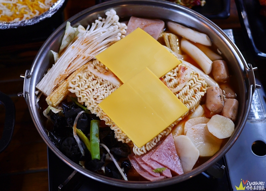 ▲部隊鍋裡面有年糕、木耳、燻腸、玉米筍、魚板、馬鈴薯、金針菇、午餐肉等配料~