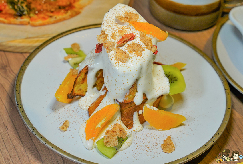 吐司烤酥後堆疊,並選用當季新鮮水果搭配,再加上自製濃郁奶蓋醬、香草牛奶冰淇淋