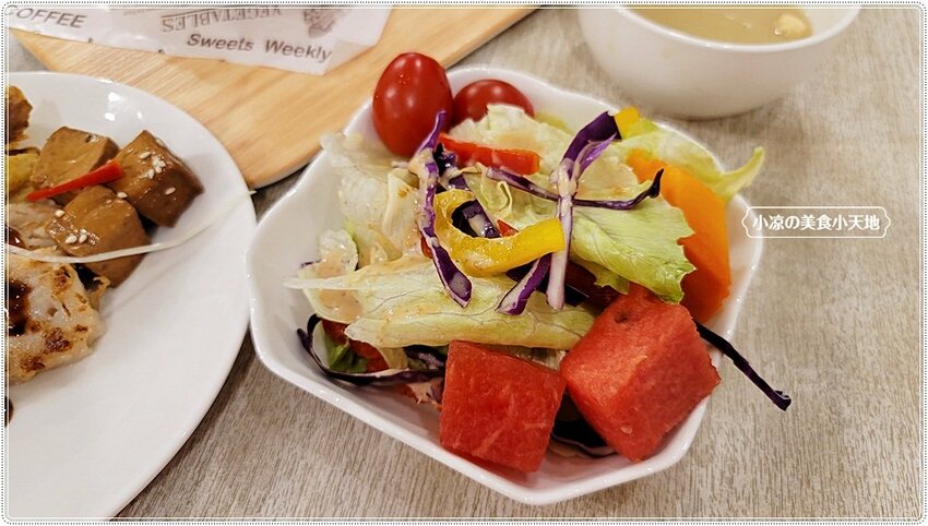 生菜沙拉吃多少夾上多少,小凉還加上了胡麻醬,在放幾顆水果就很澎湃囉!!
