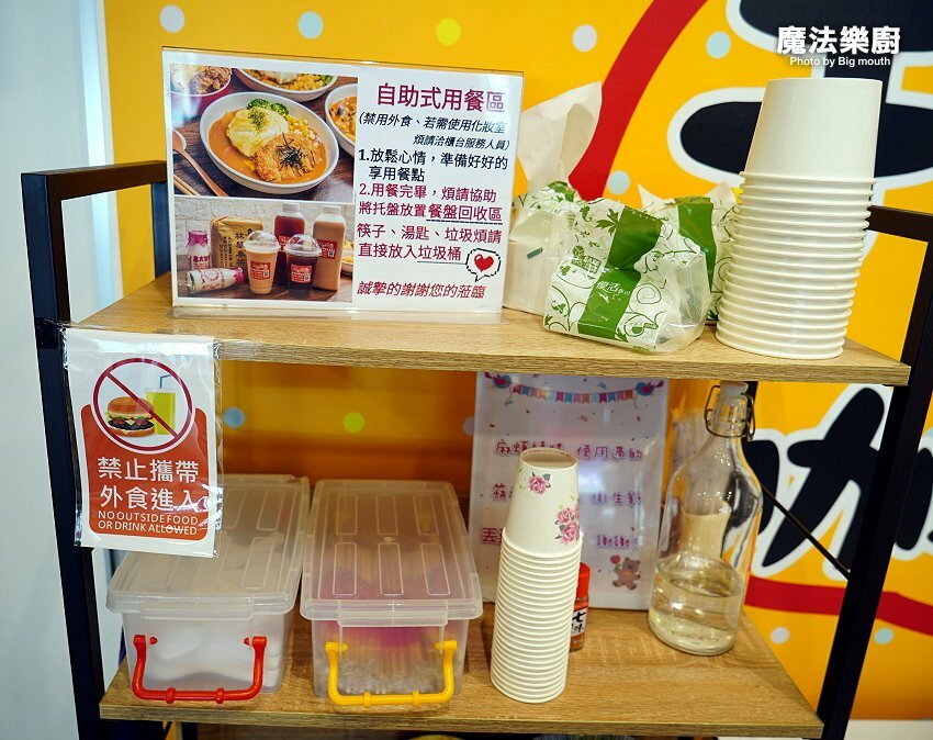 ▼這裡採用的自助式用餐方式,除了送餐之外,其他像是餐具、衛生紙、水杯等有需要的朋友都可以自行取用,用餐完畢也要請大家將托盤放置回收區,將用過的餐具直接丟垃圾桶即可!