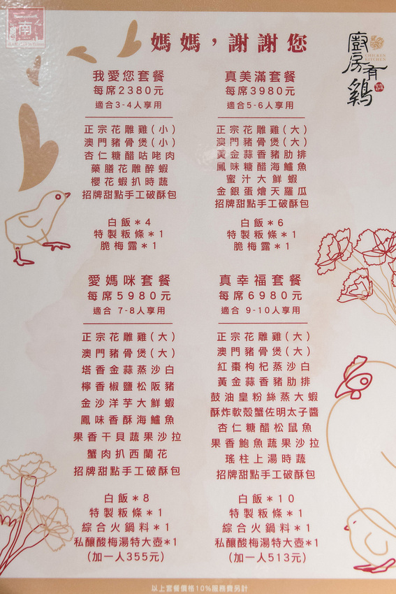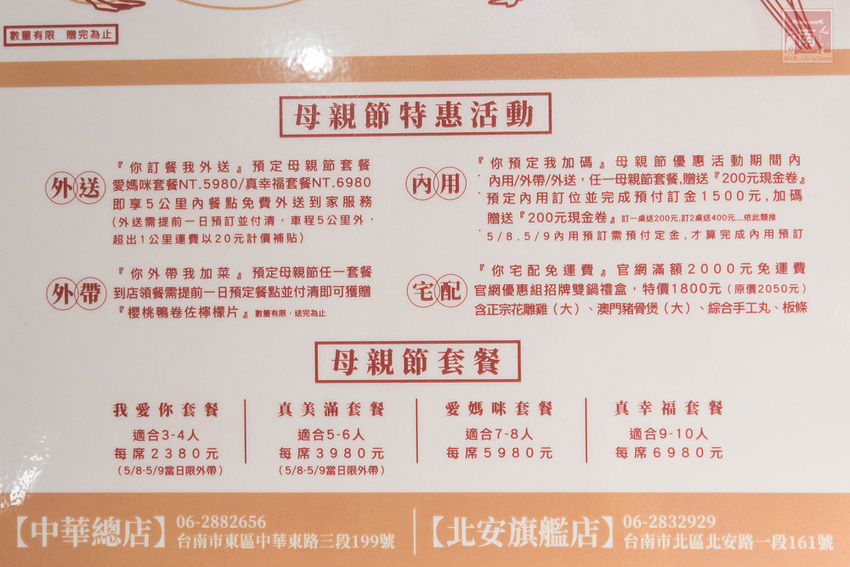 母親節桌菜已經正式開賣了,有小家庭和大家庭的合菜,價位從2380元~6980元,另加10%服務費。針對母親節推出的合菜,除了有店內的招牌菜色外,也有菜單上沒有的隱藏版菜色。如果不想出門或是在外縣市的朋友也有外帶、外送和宅配服務。
