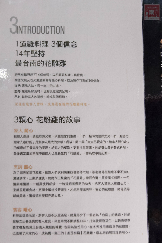 『廚房有雞』在台南算是滿有名的餐廳,已經開了15年了,第一次吃是姑丈外帶回家,小編吃了之後對於他們家的花雕雞念念不忘,後來也帶家人吃了幾次。而創辦人當時為了這一鍋花雕雞,特地多次到廣東找老師傅取經,雖然被老師傅拒絕但不放棄,最後終於把這個味道帶回台南,也針對台南人的口味和喜好,做了一些調整,成為台南獨一無二的『廚房有雞』花雕雞。