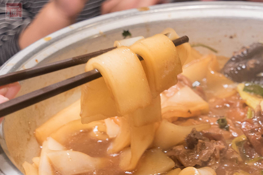 花雕雞是大份的,一上桌就先把鍋蓋掀開一點點讓它滾,一方面讓雞肉吸收湯汁更入味,另一方面讓酒精揮發。滾過的花雕雞醬汁可以淋到白飯上,雞肉吃起來很嫩帶點Q也很入味,味道甘甜但不會辣。接續就是把粄條放進去煮,讓粄條吸附醬汁,當粄條整個被上色後就可以吃了,不需要沾醬就有味道了。最後把蔬菜盤放進去煮,再加入高湯就變成了火鍋。完全是從乾吃到火鍋的吃法,一菜三吃的概念。