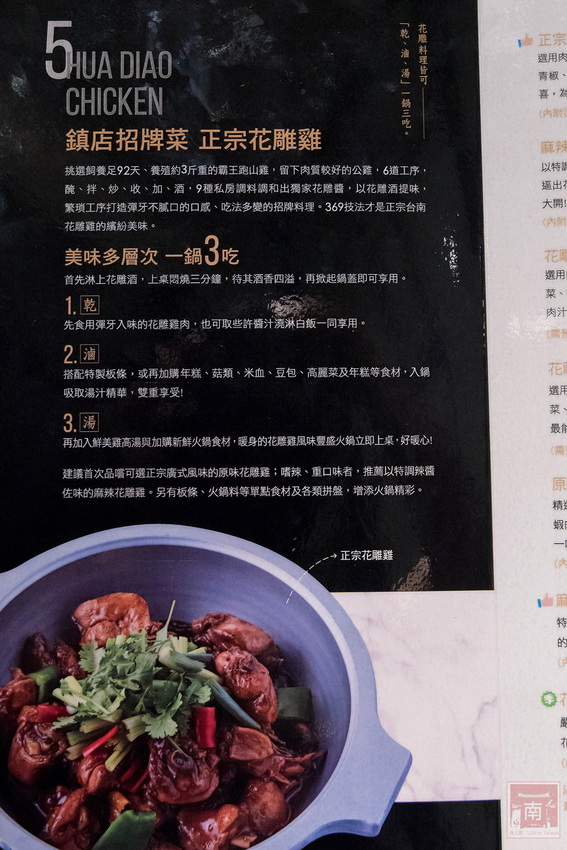 雞肉好吃的秘訣就是用了自然農法飼養的放山雞的霸王雞,只選用飼養92天的公雞。高麗菜是用梨山的尖頭種高麗菜。花雕雞的醬汁也是有所堅持,一勺醬細嚐慢調、一鍋雞慢悶細炒、一碗湯細煮慢熬的功夫,經過獨門369技法,選用3斤重的雞、6道工序、9種醬料合一,才能完成這一鍋花雕雞。