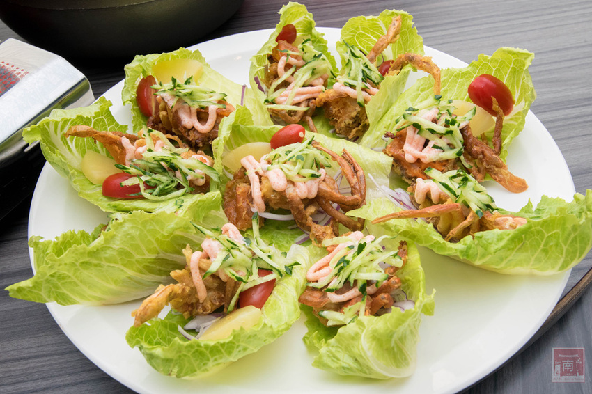 軟殼蟹炸之後含殼一起吃下去,搭配明太子醬和生菜,明太子的味道和炸過軟殼蟹屬於重口味的,但鳳梨帶點酸甜,蔬菜很清爽,整體不會讓人覺得膩感。