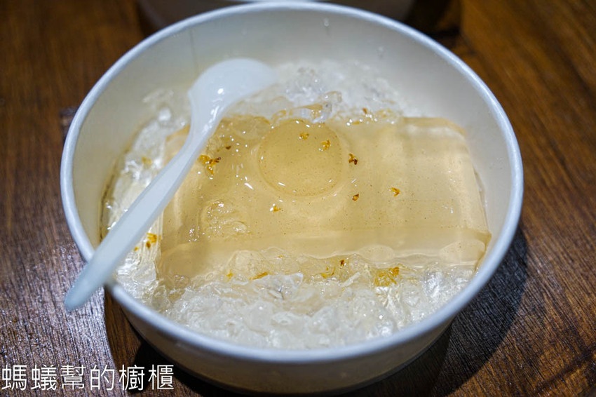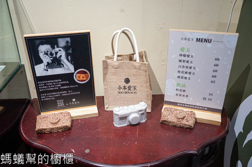 桂花蜜愛玉55。1:1 Nikon S2相機造型愛玉,相機的造型很吸引目光,淋上桂花蜜糖漿,底下則是鋪上了碎冰塊,小本愛玉主打純手工手洗愛玉,手炒糖漿,桂花蜜味道濃郁,比較適合特定群眾點選。