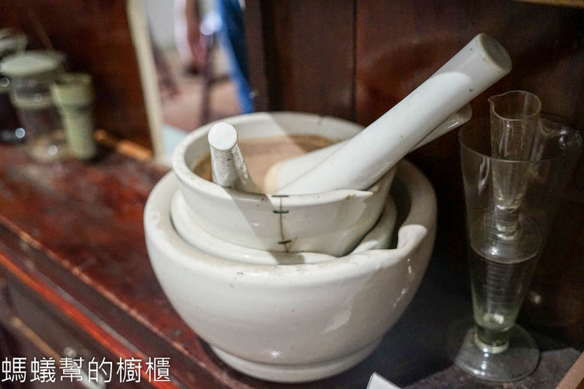 藥局裡的瓶瓶罐罐還透著些許的藥劑殘味,(這區只能欣賞請勿動手觸摸),這些茶色玻璃瓶跟20年前我在職校做化學實驗一樣的茶色化學瓶子,茶色的作用是在隔離光線,隨著時代進步,在藥廠生技廠工作了數年,除了特定化學試劑用茶用瓶保存外,不少都改為塑膠瓶保存。