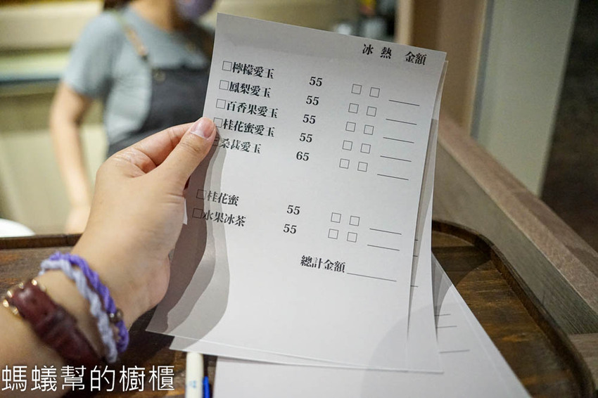朋友點了檸檬愛玉55、我點桂花蜜愛玉55。到櫃檯點餐後結帳,再到櫃台自取愛玉喔。