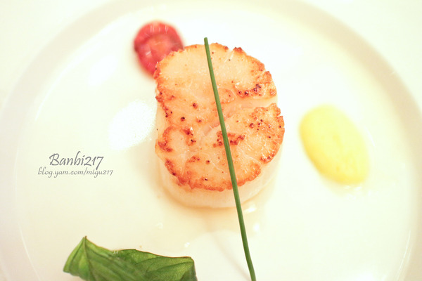雖然剛剛那一道鴨肝我覺得很好吃,但這道香煎北海道干貝來說更是讓我大推,除了這道開胃菜那好大顆的干貝之鮮美外,畢竟鴨肝那濃郁的味道與油脂可不是人人都欣賞的呀(像斑比我喜歡但我老公可不敢吃)。