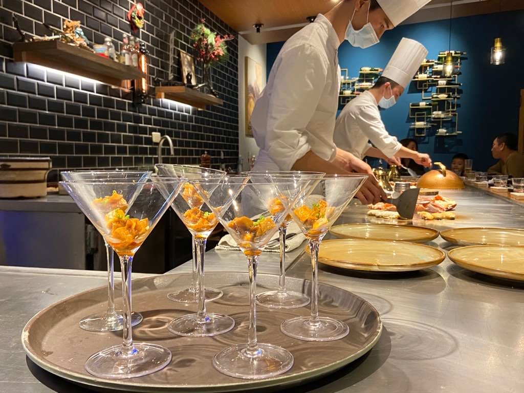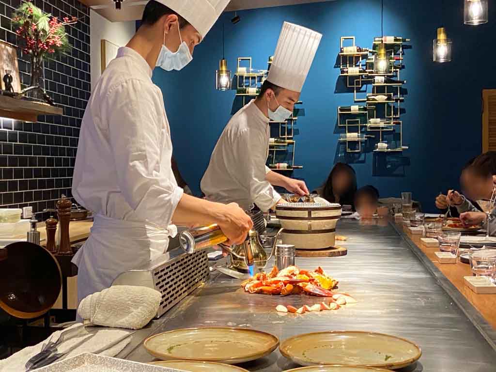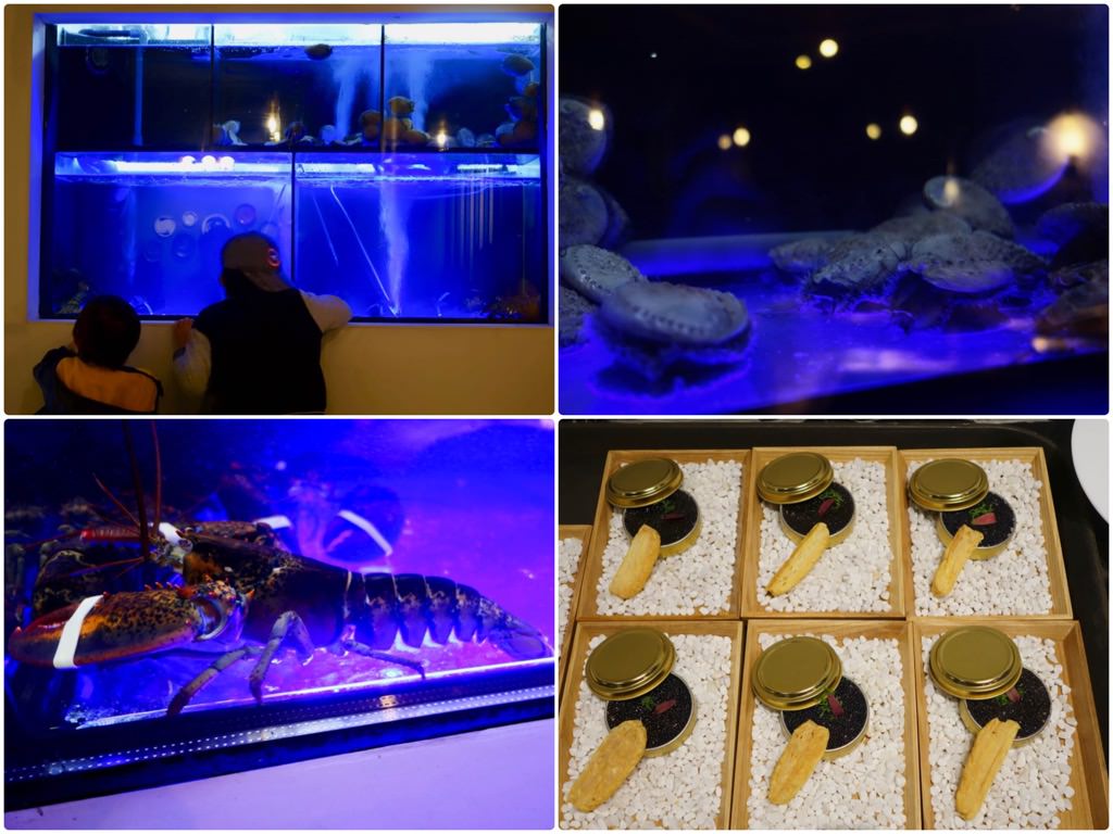 ▼廚房口旁邊有活跳跳的新鮮鮑魚與龍蝦,還有在備料區的魚子醬,看起來好美味啊!