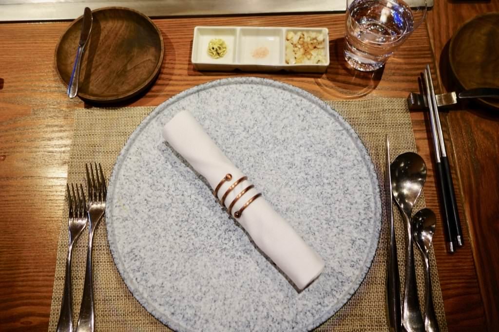 ▼ 餐桌上的擺設很舒心,有木質與看起來像石製的盤器,還有三種調味佐料。