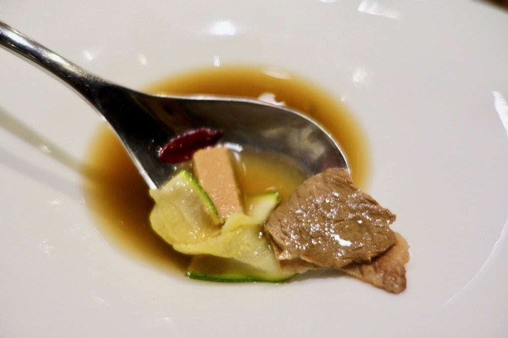 ▼ 湯品是牛肉+鵝肝慕斯,牛肉有松露香氣,湯帶有蕈菇香味,佐新鮮大黃瓜片,喝起來層次非常豐富!