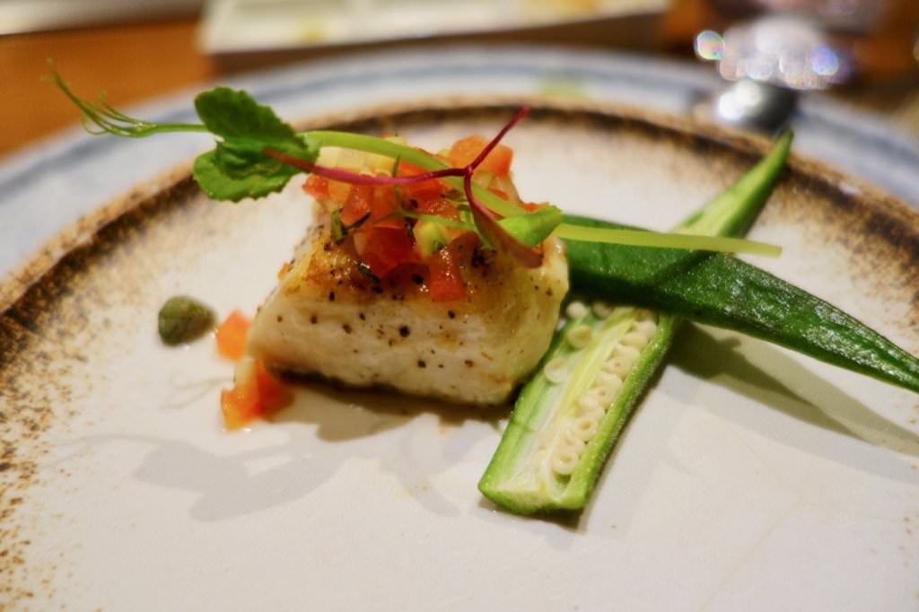 ▼ 午仔魚佐酸豆莎莎醬以及水耕生菜,加上新鮮秋葵~午仔魚本身的肉質就很好,加上莎莎醬以及些許檸檬汁,非常好吃。