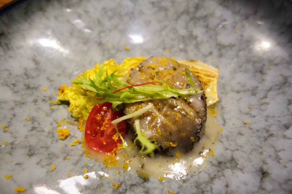 ▼ 接著來的是新鮮鮑魚,鮑魚料理時有去口跟內臟,搭配松露奶油醬以及娃娃菜與少量生菜、番茄,非常嫩Q。