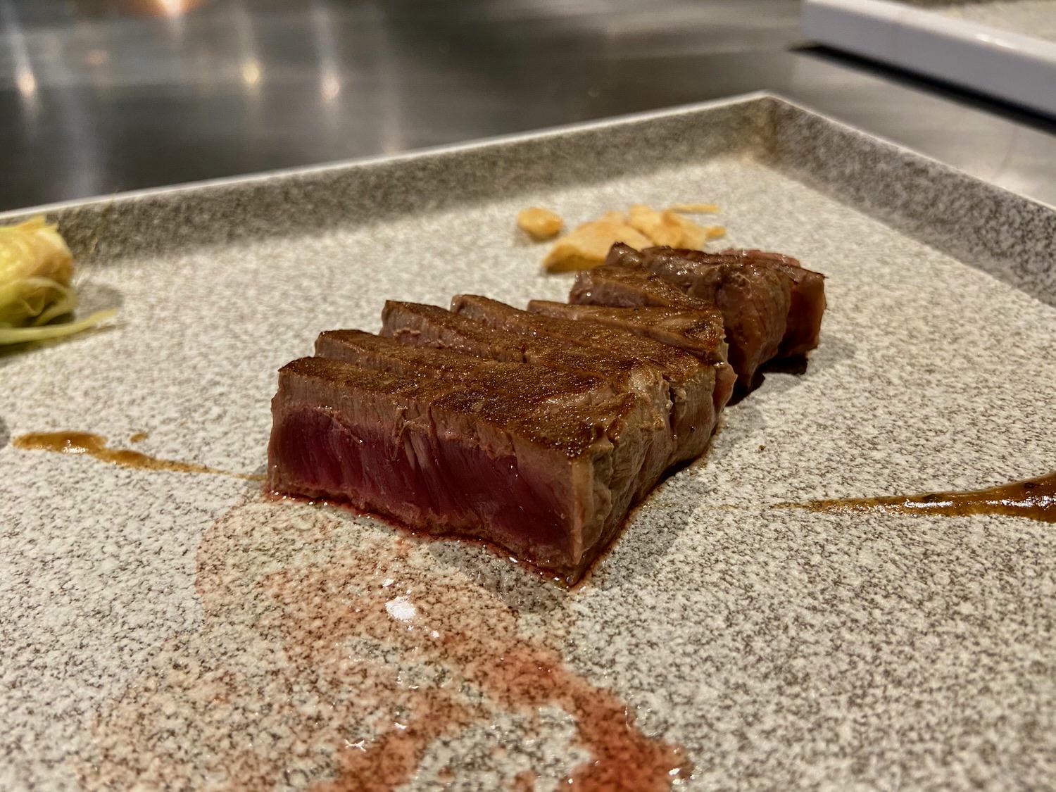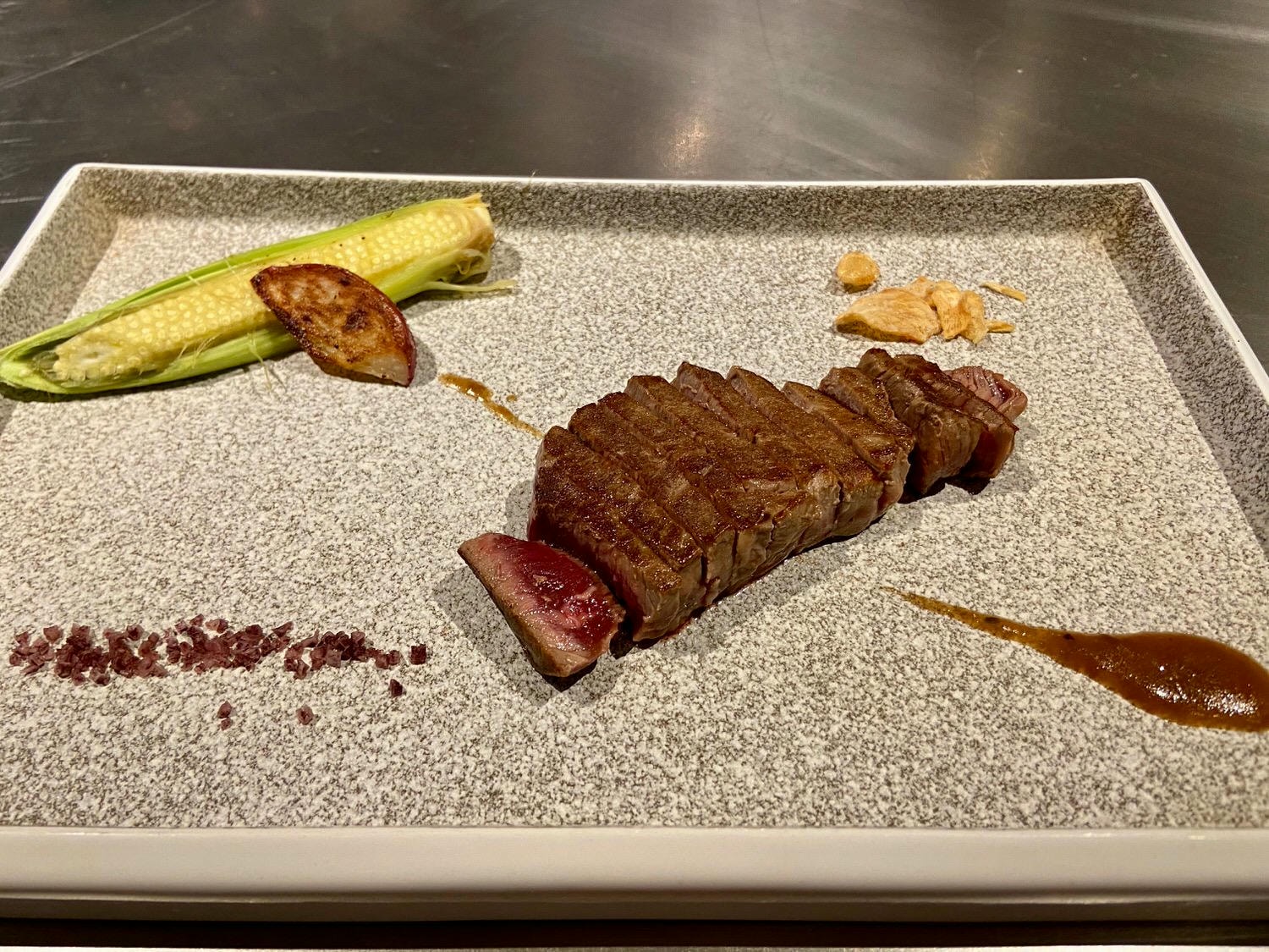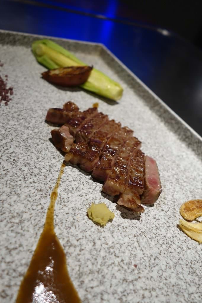 ▼ 日本頂級A5和牛,搭配法國紅酒鹽與山葵醬,入口即化,綿密中透著讓人難以忘懷的和牛香氣,目測感覺3oz左右,我家吃貨小孩真的懂吃,吃過之後就說要吃和牛不要吃菲力(其實菲力也好吃啦XD)。因為太快就吃完了,帶小孩來吃只能抓空檔拍照,請PASS照片的部分XD,只要記得和牛真的無敵好吃就好!