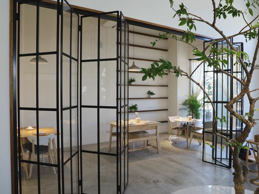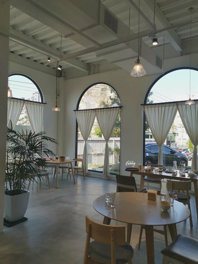拱型的落地窗加上白色窗簾,簡約的燈具及寬敞的桌距,看起來很舒服。