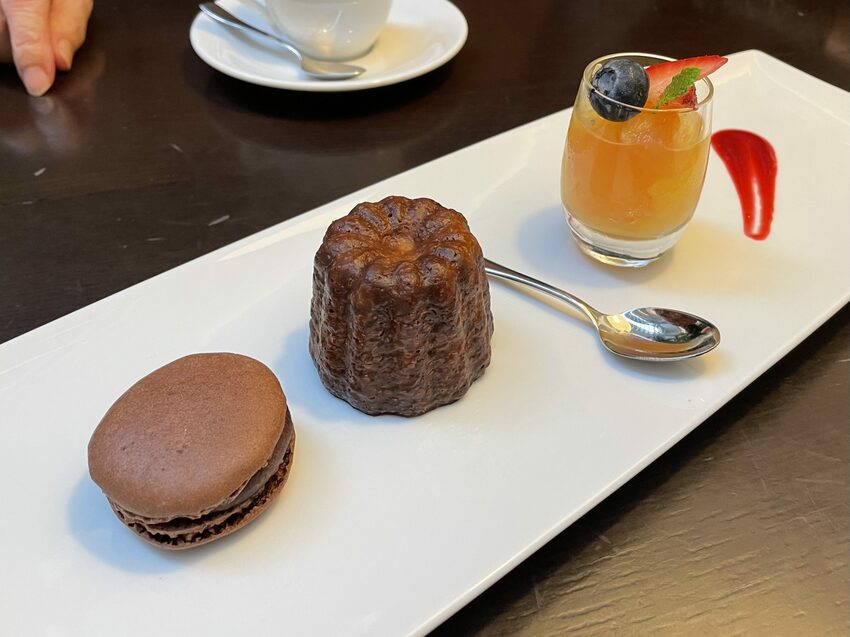 一人份的甜點盤會包含三樣小甜點佐蔓越莓果醬,馬卡龍一個是黑巧克力馬卡龍、一個是焦糖布蕾布丁。下圖是黑巧克力馬卡龍的。