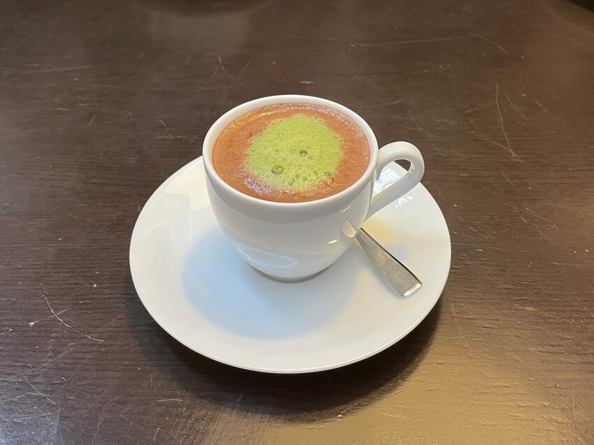 超級期待喝他們的巧克力,畢竟IR是來崇聖名牌巧克力店的!看到這一小杯,心中OS這是義式濃縮瑪其朵咖啡的巧克力版嗎?喝了一口,很香、好濃的巧克力味,抹茶與巧克力調配的很搭,這裡的濃郁不是很甜,是一種巧克力厚實的清香。雖然小小的一杯,配甜點真的很剛好,去膩又不會出現很突出的搶戲。