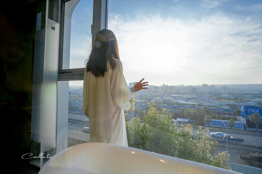 落地窗邊的,就是余舍行旅有名的浴缸,位置就在交流道旁邊,確實會讓人有些害羞。