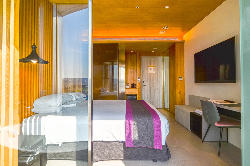 這次住的這間輕奢鵝蛋雙人房,是位在八樓的 805 號房,一直以來我都很喜歡余舍這間房型的設計,滿滿的木頭和大廳相呼應,雖然房間仍然是西式房型,在大量木材的點綴下,卻變得很有日本溫泉飯店的氛圍,尤其在不能出國的現在真的超級想住一下!