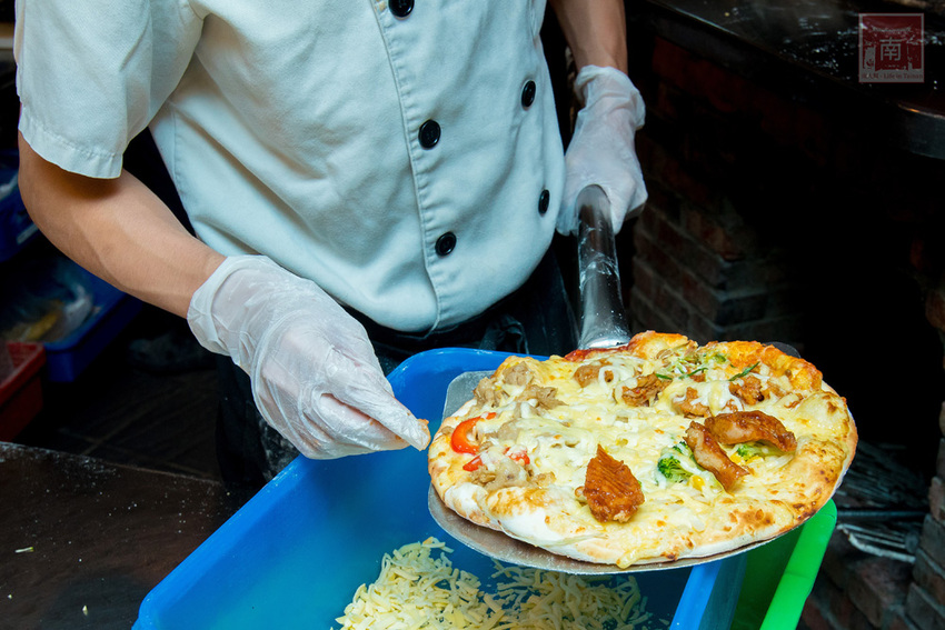披薩都是現點現做的,從麵團、擀麵、批料到窯烤,都是客人點餐後才開始製作。而且是半開放式的廚房空間,可以看師傅現場製作披薩,而且用什麼料、怎麼製作都讓客人看的一清二楚,不是使用冷凍披薩直接烤箱烤,而是手工現做、窯爐燒烤。