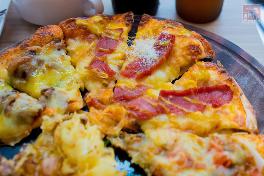另一份披薩我們也是選了三種口味,有『春川辣雞腿』、『韓式打拋豬』和『功夫紅糟叉燒』。Double cheese是現擀現烤的薄片式披薩,個人覺得薄片也不錯吃,薄片多了餅皮的脆感和Q度。