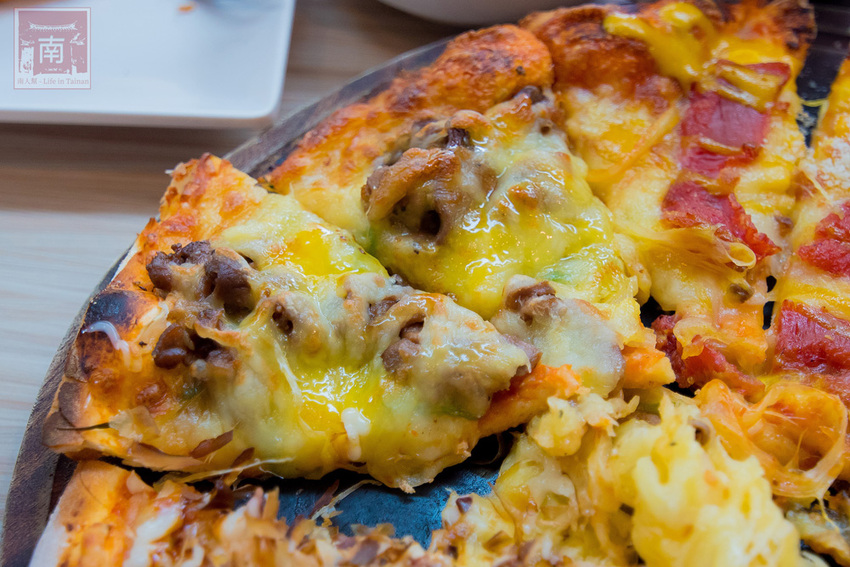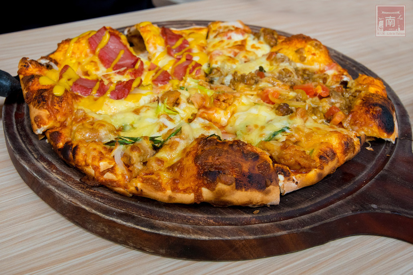 披薩看要一個做一種口味,還是一個做三種口味,因為我們的人數比較少,又想吃多種口味,所以我們點了一個披薩三種口味的,這一個是『大阪章魚燒』、『夏威夷鮮蝦』和『橙汁櫻桃鴨』。披薩不是冷凍退冰烤箱烤的,而是從麵團到成品,都是師傅手工製造,麵餅皮是用特製配方製作,使用石窯烤過後,脆脆香香QQ香香的,再搭配起司和配料香又好吃,但個人建議熱熱吃最好吃。