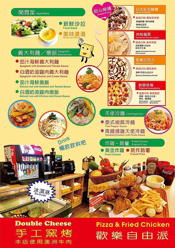 Double Cheese台南成大店 20款現做手工窯烤披薩吃到飽,炸雞酥脆多汁必點,還有炸雞、薯條、義大利麵、燉飯、飲料、冰淇淋等吃到飽,訂位打卡再送干貝舞海鮮披薩。