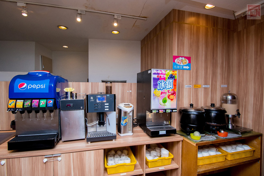 自助區就是自己用的區域,有湯品、飲料和冰淇淋。湯有香菇清湯和玉米濃湯。飲料冰的和熱的加起來有10幾種,從擺可樂、七喜、氣泡葡萄汁、激浪汽水、檸檬風味紅茶、嘉年華橘子汽水、冬瓜檸檬風味飲、水果風味茶、芭樂風味綠茶、熱美式、熱拿鐵、熱肉桂拿鐵、熱紅茶、熱綠茶、熱烏龍茶。冰淇淋是杜老爺的,有五款。