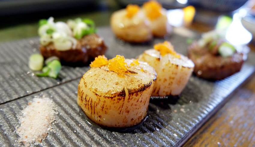 A5和牛及干貝炙燒過後香氣爆表,就算已經滿桌好肉,還是會忍不住被現場的炙燒肉香吸引過去XD,好香啊!