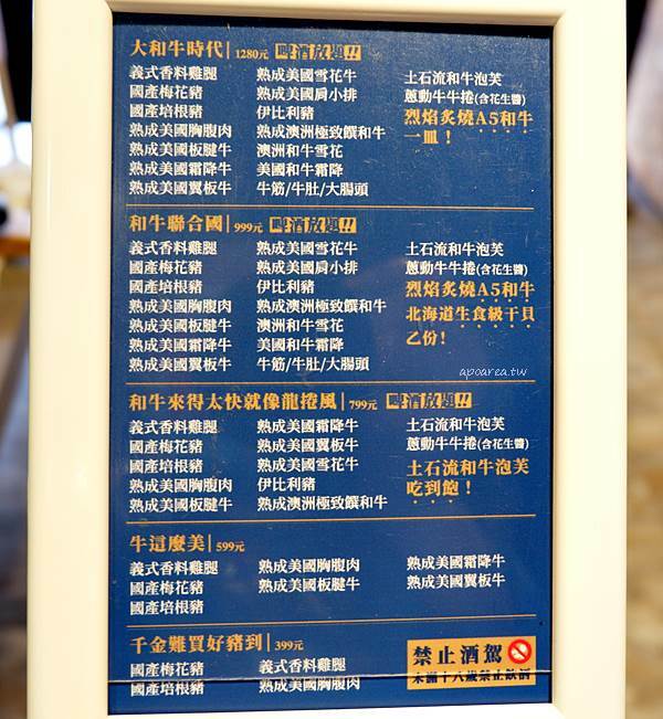 另外包含多種牛肉品項的吃到飽價格有599元、799元、999元及1280元。799元以上的價格包含土石流和牛泡芙及蔥動牛牛捲吃到飽,還加上可以啤酒無限暢飲,999元以上更有十三種肉品及牛筋、牛肚、大腸頭,更多了每人一份的炙燒A5和牛。也有更高等級的日本A5和牛方案,每人1580元就可以無限享用日本A5和牛的美味。