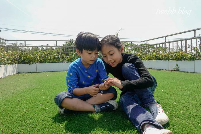 順著一旁樓梯往上爬,就像發現新大陸一般,他們姊弟倆已經佔領成為自己的秘密基地,交換著剛剛在樓下撿到的樹葉果子。