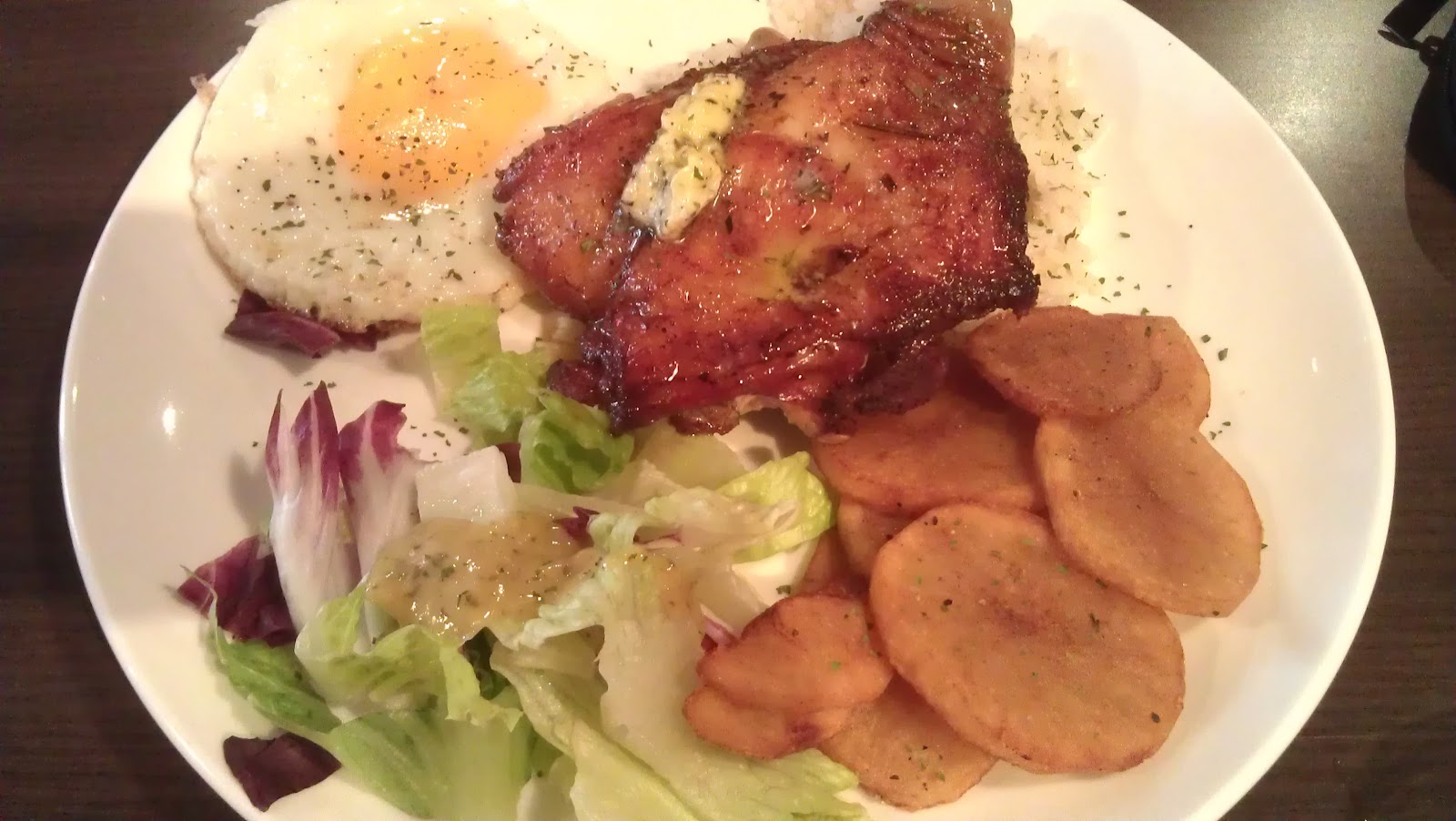 香嫩的煎烤雞腿排、佩斯特奶油、匹拉夫燴飯、生菜、太陽蛋、薯片(亦可換薯泥 or 脆
