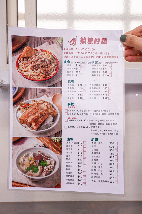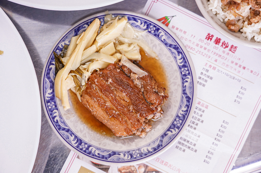榮華炒麵菜單 主打50元銅板有找的魯肉燥飯、炒麵、爌肉飯、豬腳飯,還有推出$65~$100的三菜一主食高CP值的便當,就連湯品也全是50元銅板有找,想要吃得豐富又澎湃榮華炒麵也有推出兩款單人和雙人套餐,整體價位可說是台中平價小吃美食!