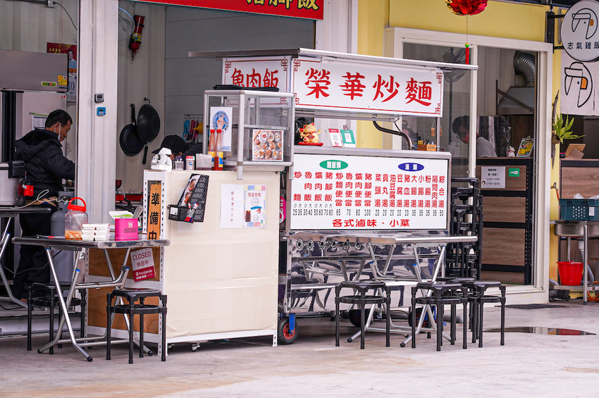 主打魯肉燥飯、炒麵、爌肉飯、豬腳飯等小吃美食的榮華炒麵 店面相當樸實簡單,有提供些許內用座位和外帶服務,內用座位雖然沒有冷氣,但有遮棚和電風扇其實也蠻涼爽的。