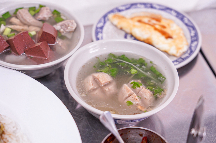榮華炒麵的湯品我最推薦這碗只要$50元銅板料快滿出來的綜合湯,裡面有豬血、粉腸、大腸、隔間肉、小腸,大骨熬製的湯頭沒有多餘的渣渣,喝起來清甜又鮮。