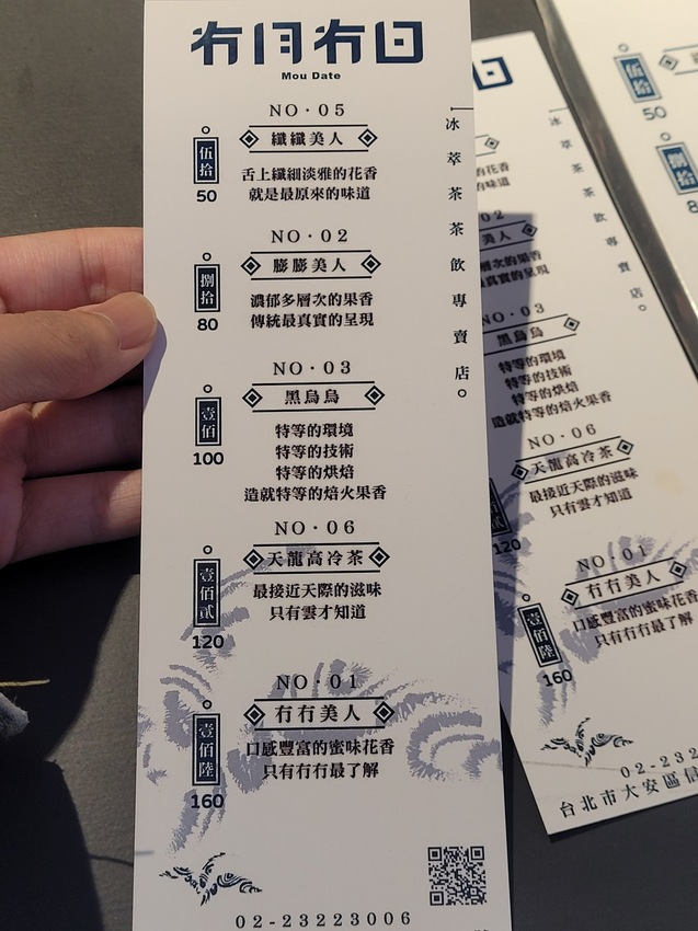 對應剛剛上面的菜單,由左到右依序是纖纖美人茶($50),膨膨美人茶($80),黑烏烏($100),天龍高冷茶($120),以及店內的招牌「冇冇美人」($160)。