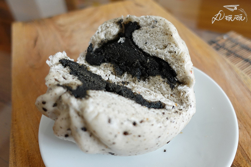 麵團中加入芝麻之外,內餡採用有機芝麻研磨而成的芝麻餡,不添加人工油脂香料,呈現芝麻自然的香氣。這款芝麻包會與普遍市場吃到偏泥狀的口感相差甚遠,小日和的口感接近被壓緊實的粉狀,吃起來容易碎開,也因為內餡的量夠真材實料,吃到後頭稍嫌乾膩了些。