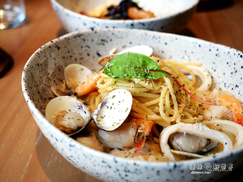 橄欖油清炒無使用過多調味反而能展現出綜合海鮮(中卷、蛤蜊、鮮蝦)本身的鮮美,