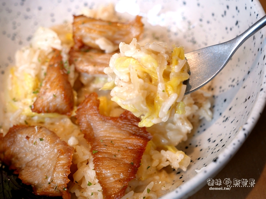 香煎到金黃的薄厚均勻松阪豬咬起來口感爽脆、咀嚼起來飽含甜甜原始肉汁,米粒分明。