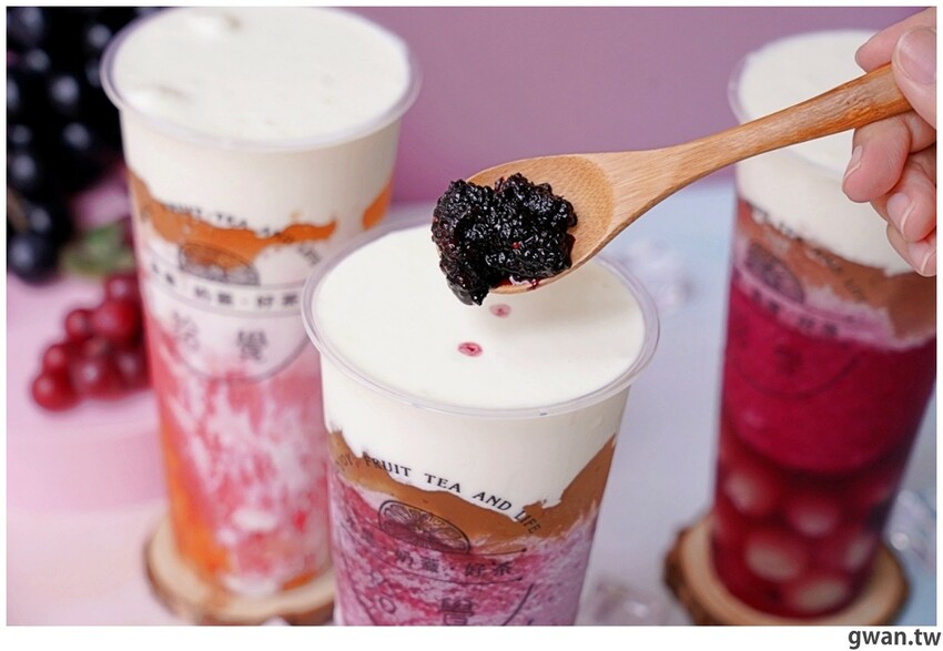 中間用進口葡萄果醬與青茶打成透涼冰沙,多了淡淡茶香讓冰沙喝起來不單調!透著杯子還能看到一顆顆完整的葡萄果肉,圓滾滾的看起來好療癒啊~