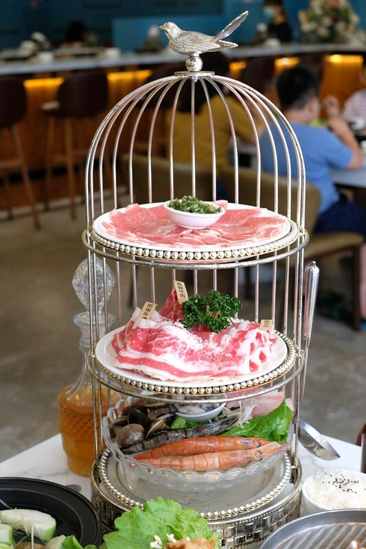 這個套餐雖說是雙人套餐,主要是一個火鍋外加一個火烤兩用鍋,再加上這個鳥籠達到三層的肉品+海鮮,其實三個人吃都綽綽有餘。這個網美等級的鳥籠吸引很多客人打卡拍照哦