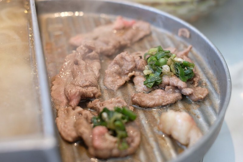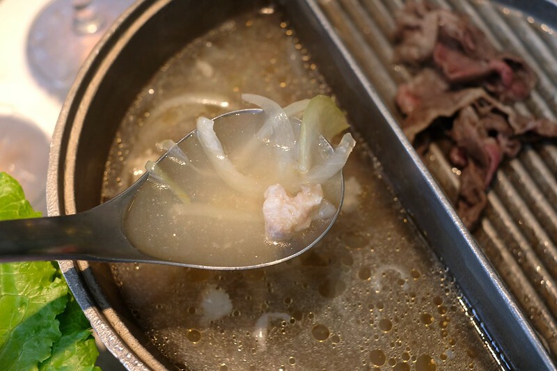 這就是火烤兩用的鍋子啦!烤肉那邊有附上一小塊培根可以使用,讓肉不會沾鍋。左邊是石頭火鍋的湯頭~