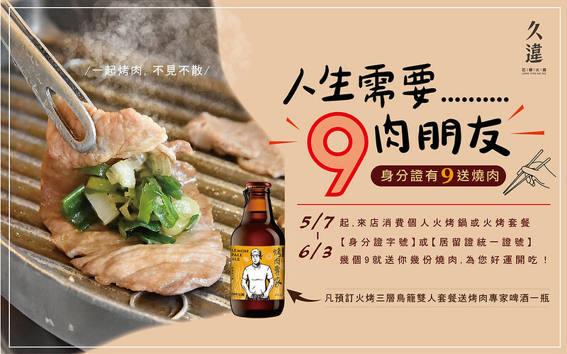 身份證有9就送燒肉一份(2.5 OZ),出現1個9就送一份,每桌無上限。
