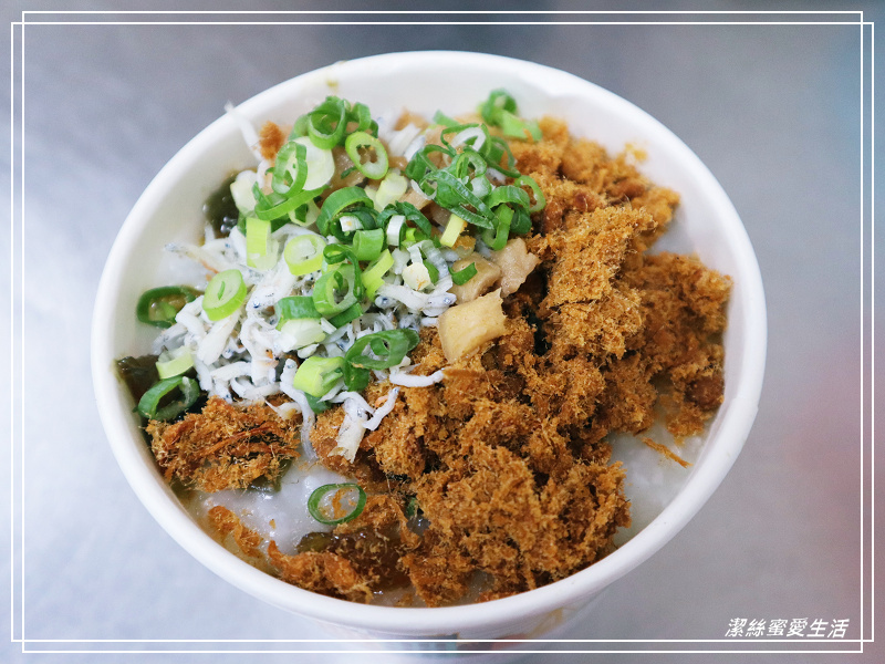 所謂的綜合,當然就是把所有料通通加進去——有肉鬆/皮蛋/魩仔魚/菜埔,上面再灑上蔥花,一碗台式粥品就完成啦!