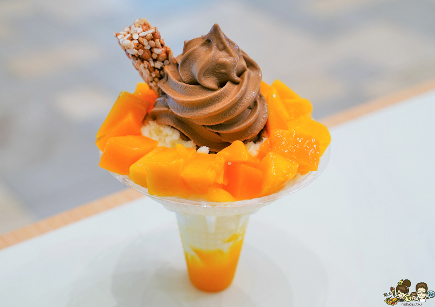 加入新鮮芒果、芒果果醬、牛奶雪花冰,還有鹹香酥脆爆米花