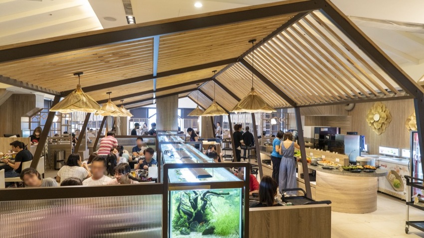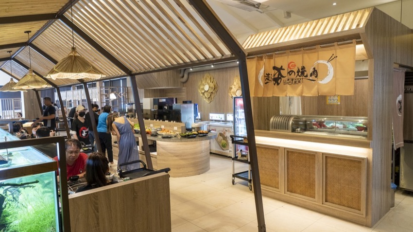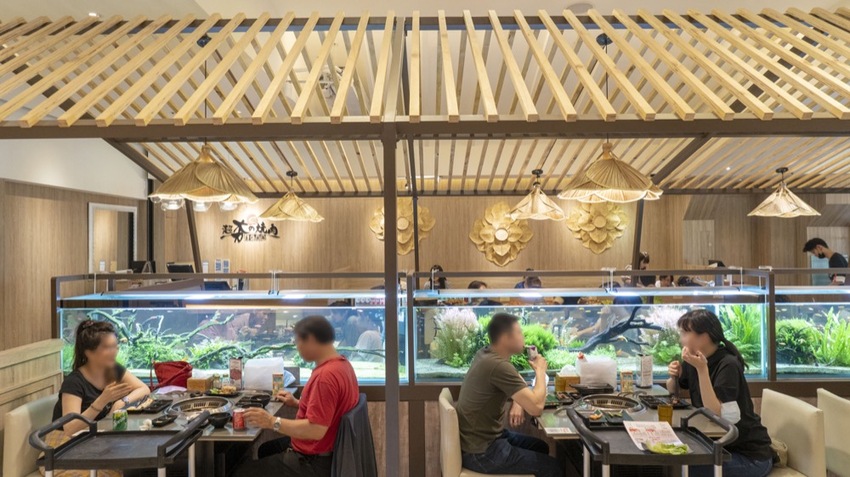 「超夯の燒肉」林口店裝潢更加大氣,挑高天花板搭配中間座位區木質遮棚造型,內用區非常特別又舒適,中間座位區還有一整排水族箱,一邊吃燒肉、一邊欣賞魚兒游啊游,會不會太愜意了呀~