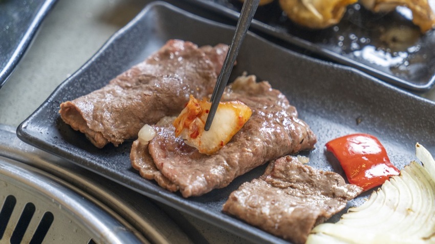 來到今天的重頭戲「和牛吃到飽」,看看這油花豐滿的見島和牛背肩肉,雪白的油脂佈滿整片肉,在烤網上烤過之後,油脂融化轉變成滿滿牛肉香氣的肉汁,一口咬下滿嘴濃郁牛香,有夠好吃啊!另外還有 M9等級的澳洲和牛也同樣吃到飽,油脂偏高的澳洲和牛,鮮嫩多汁的口感,一入口肉片瞬間化開,配上泡菜一起吃更解膩開胃,又能多吃好幾片啦~~