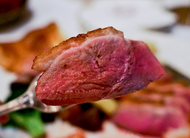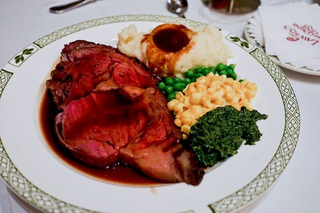 那時的感覺就是,這牛排與眾不同些。我們常吃的牛排一般都是煎或是烤的作法,表皮都會微焦。然後在Lawry's 吃的第一印象是,哇哩勒這牛排是不是沒熟,整份血紅血紅的