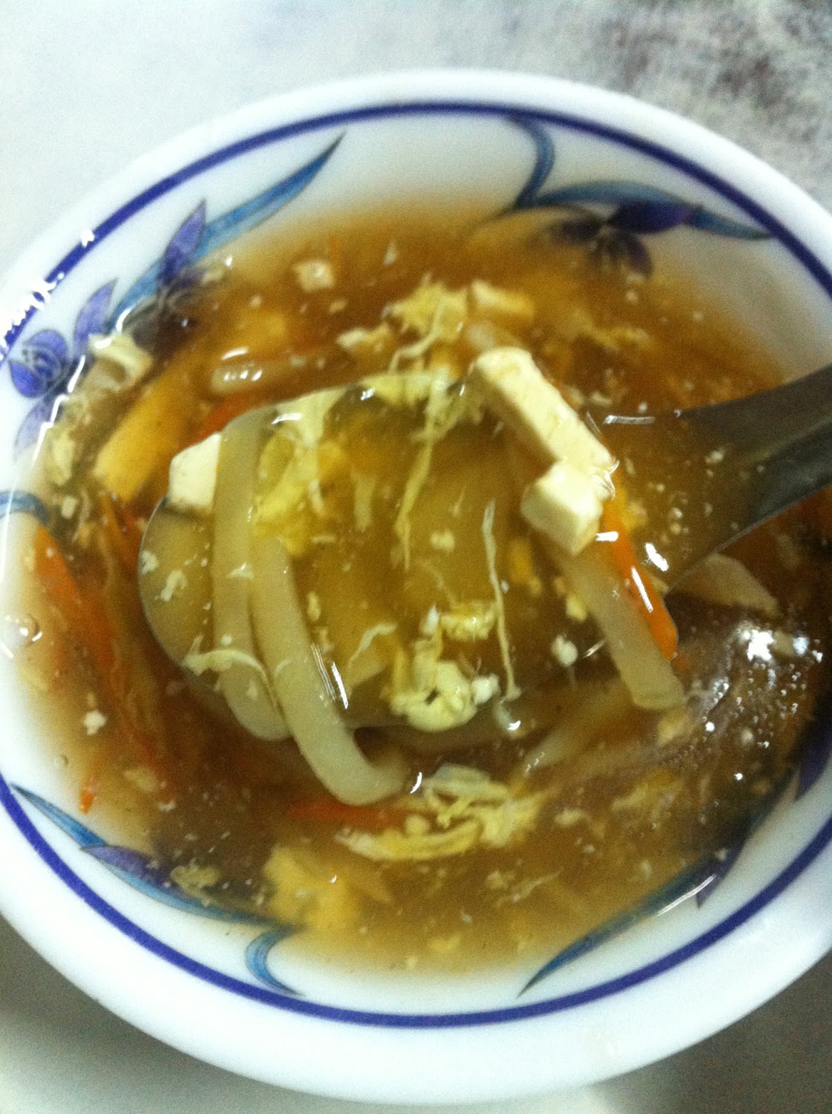 酸辣湯先上,有豆腐,蛋花、筍子、黑木耳和胡蘿蔔,不太辣也不太酸,口味算淡。不過算便宜只要20元